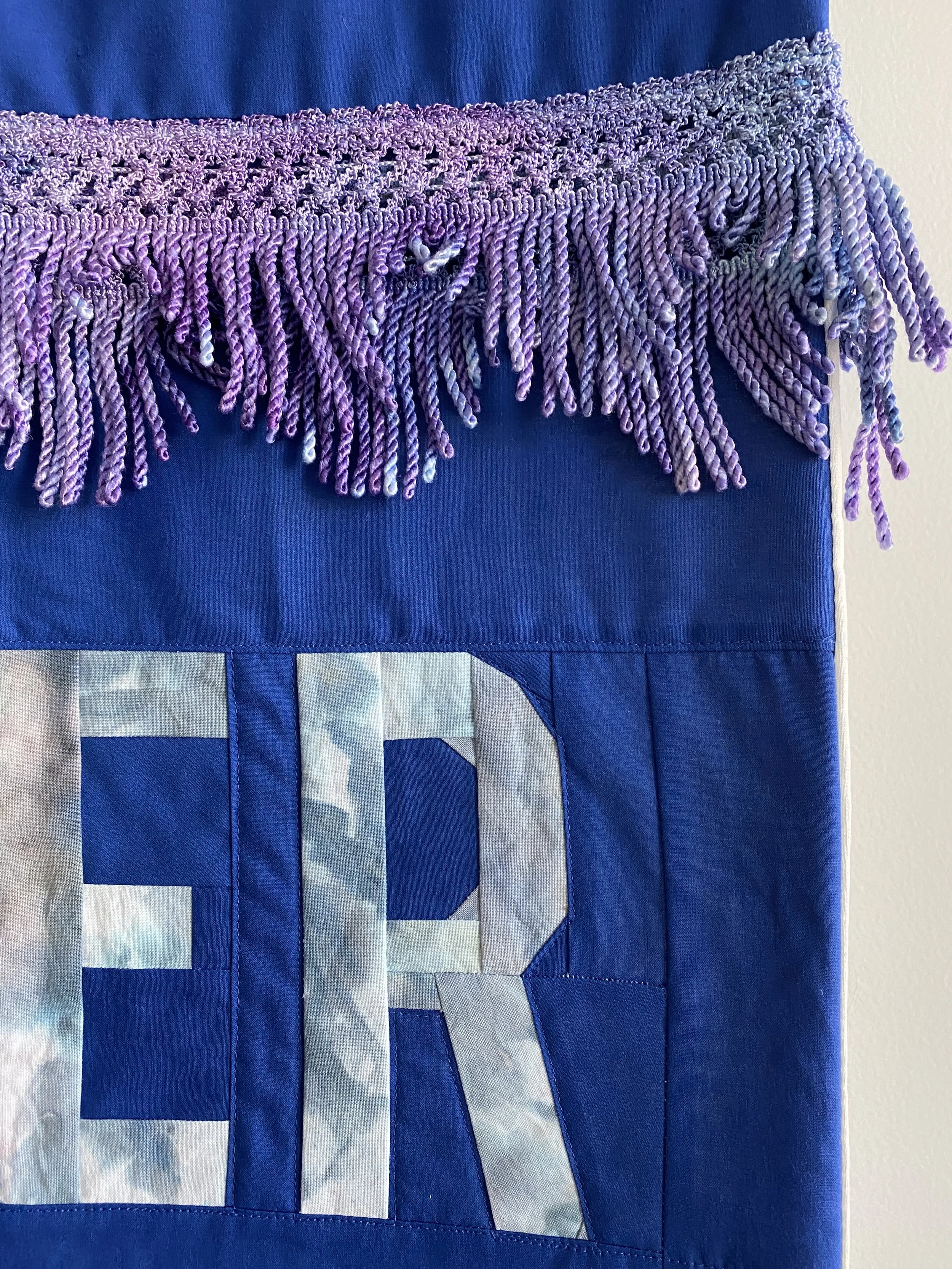 I made this because I wanted to ruminate on what being cancer-free means to me…and I wanted to be able to announce it in a cool way. I ice dyed the “cancer free” fabric and trim. I was inspired by old-timey fraternal society banners.